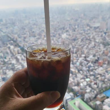 東京の観光地・スカイツリー展望デッキ内にあるカフェは、高さ340mからの圧倒的な景色と共にくつろげる特別な空間です。青空や夕焼けをイメージした華やかなドリンクがあり、ノンアルコールからカフェラテ、アイスコーヒーまでメニューが豊富。南西方面の大パノラマからは東京タワーや隅田川、かちどき橋などが一望でき、時間とともに移り変わる景色を眺めながらゆったりと過ごすことができます。平日なら比較的空いていて、落ち着いて絶景カフェタイムを満喫できる点も魅力です。