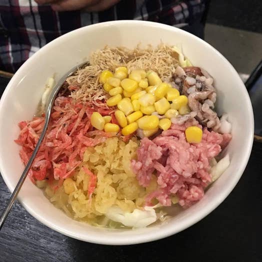 基本のもんじゃにこれまた基本トッピングをいろいろのせた初級もんじゃ。