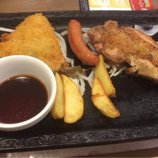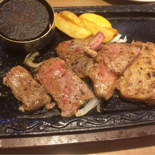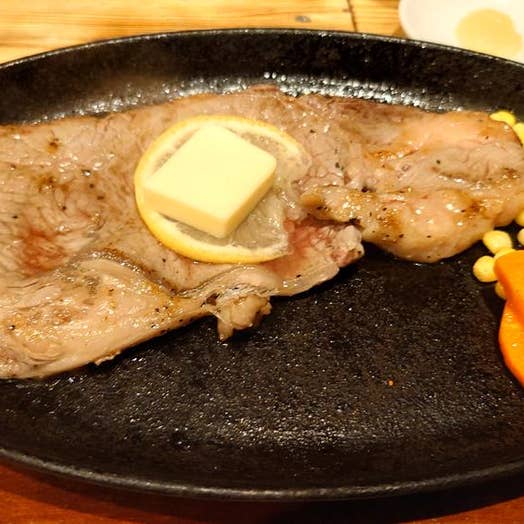 メインのハンバーグは柔くてジューシーでソースはデミグラスと醤油ベースのステーキソースの2種類が付き、あっという間300gペロリの美味しさ。