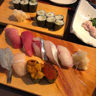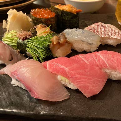 お店に入ると、配膳ロボットがペタペタと歩きながらお茶を運んでくれるなどユニークな演出が魅力です。カウンター席ではスタッフやロボットにコインを渡す仕組みもあり、来店体験をより楽しくしてくれます。名物の『さくら御膳』は新鮮な大きめのネタが乗ったにぎり、茶碗蒸し、そば、もずく、ドリンクバーがセットになっていてボリュームも満点。そばはやや濃いめのつゆと白い麺がよく合い、思わず大盛りを注文したくなる美味しさです。食後にカフェモカなどのドリンクも楽しめます。生け簀の伊勢海老や長い玉子焼きも目を惹く、活気のあるお寿司屋さんです。