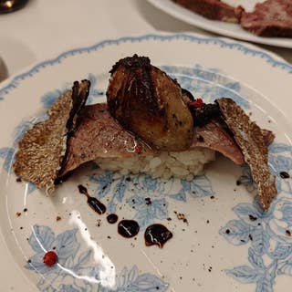 マグロテールステーキ・アジ・本鮪赤身。 神奈川県小田原市の小田原ICの前にある回転寿司。 ここは「ビストロを楽しめる回転寿司」としておなじみで、全国回転寿司ランキングでは上位に来るお店。 小田原散策からの帰り道に最後に立ち寄ったのがここ。 長年あるのは知っていたがタイミングが合わずにスルーしていた。 火曜の12時に着いて店内は7割ほど席が埋まっている。 特にボックス席で酒盛りが始まっている。 それもそうだと思えるくらい壁際にはビール・日本酒・ワインなどが所狭しと並んでいる。 壁のメニューをみるとビストロメニューがたくさんあり、むしろ寿司より多いのでは…? 6軒目なので少しだけ食べて帰ろうと思っていたので、寿司からアジ・山幸の本鮪を、 もう一つの売りであるビストロからマグロテールを注文。 (追加は促されたが小田原の地魚が太刀魚しかなかったので他を食べる気がしなかった) アジは大ぶりにカットされていて鮮度が良い味。 本鮪の赤身はねっとりとしていてマグロの旨みが強い。 テールステーキはニンニクチップが乗って味を締めている肉厚の身が箸でほろっと崩れる。 ここのビストロはお酒に合うものが多いゆえに昼よりも夜に使うのが良さそう。 寿司を食べれるビストロという方が実情に合うと思う。 小田原に泊まることがあれば美味しいビストロだと思う。