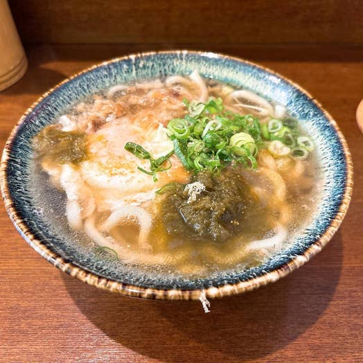 とろみのあるカレーに、高知県から50年近く直接仕入れをしている何種類もの鰹節がブレンドされて作られた、甘みと旨みの備わった汁とが交じり、絶妙な旨さとなり、細うどんの絡みと滑らかさが堪らない味わいなのだ。