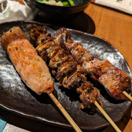 ここのお通しは珍しい蒸しキャベツ。ホカホカのキャベツに塩昆布が乗っていて、ごまわさびソースとバジルチーズソースをつけて食べます。柔らかいキャベツがとても美味しく、個人的にはバジルチーズソースがオシャレな感じもして美味しくて好きでした。焼き鳥は少し時間がかかりますが炭火焼きでしっかり焼いてくれます。プリプリの身のもも、ぎゅっとした身で旨みの詰まった手ごねつくね、どちらも美味しかったです。個人的なNo.1は長いものもっちり揚げ!お米みたいにもっちりぎっしりしていてカリモチな食感がめちゃくちゃ美味しい!