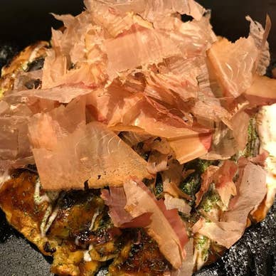 お好み焼き、長芋たっぷりで、ふわふわな生地。カリカリな豚肉と合う