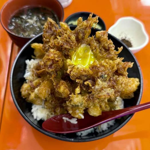 日替わりの魚介がたっぷりと入った揚げたてのかき揚げに特製タレが相性バツグンです。