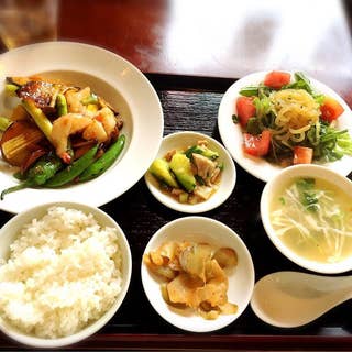 その日のAランチの、海老と野菜の炒め物定食です(メニュー名失念すみませんm(_ _)m) 珍しい組み合わせの野菜が入っていたのと、海老の美味しさで大満足でした!