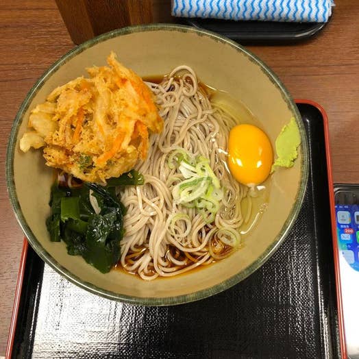 父は温かいそばで(少なめそばの)天ぷら蕎麦。