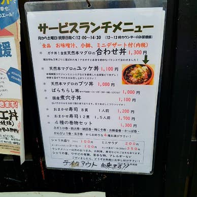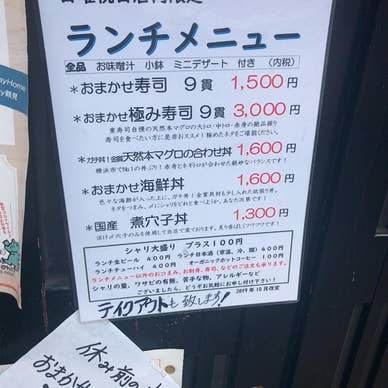 ここは子供の時から 親が何かあると食べに来るお店です。 大抵は二つしか無いお座敷の一つで食べている 年に一度、食べ放題をやる 私はいつも、お酒をのみながら、にぎりを一人前たのんで お魚のお造り 最後に鰻丼を食べておわり見たいな感じ もちろん、家族で食べるよ 今回は満席で入れなかったので看板の写真のみ 味は確実に美味しい 良く、万馬券を当てた地元住民が来てる感じ(^・^) 昔、日本酒にはまってたときは 煮魚を頼んだところ 苦手な梅干し入りの ヒラメの煮付けを無理矢理注文させられたが 梅干し入りの煮付けは旨かった そんなお店です。 2020/10/15 写真追加 ランチメニュー #回らないお寿司屋
