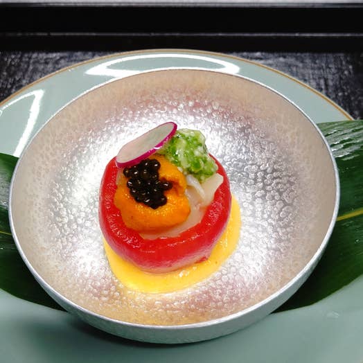 甘鯛の若狭揚げもふわふわで岩塩で甘みが引き立ちます。身と皮がそれぞれ揚げてあって食感の違い楽しめます。からすみバターは濃厚ですが、個人的にはその味になっちゃうので岩塩が好き。