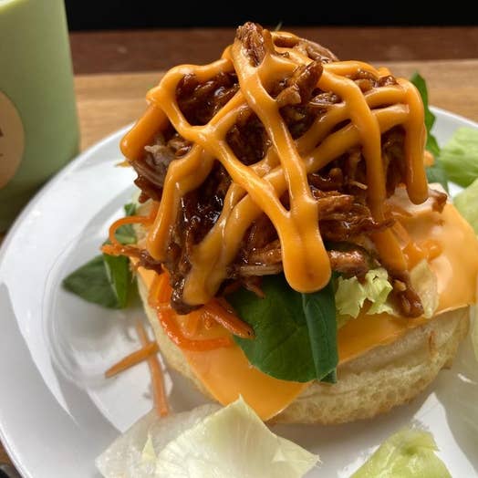 パンケーキのようなクランペットにチーズやレタス、ピクルス、ポークがのった感じ。