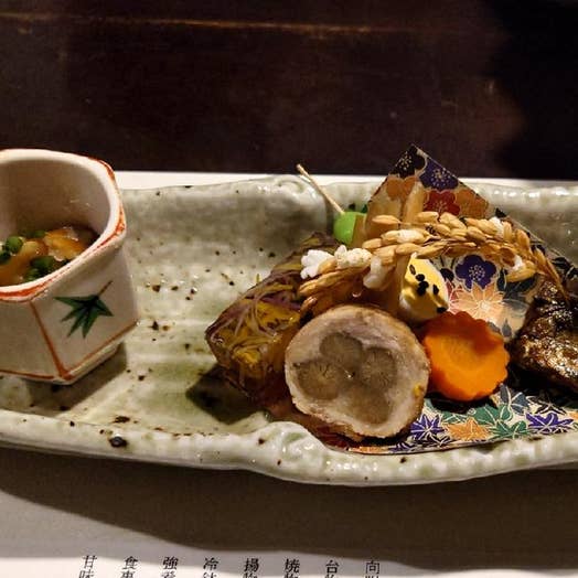 メインの飛騨牛赤身と、鎌焚きご飯は穴子と山椒の炊き込み。飛騨牛は、わさび、もろみ、ガーリック、ヒマラヤ塩などで醤油をベースにしたソースと一緒に食べるが、赤身のまず肉の味が旨い。塩とわさびが最高。