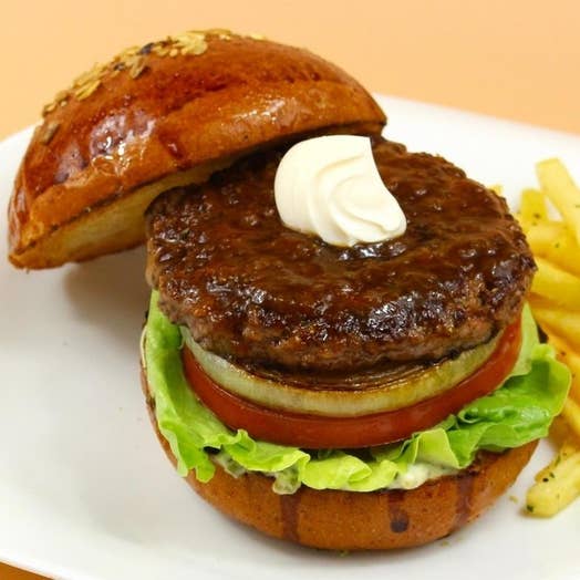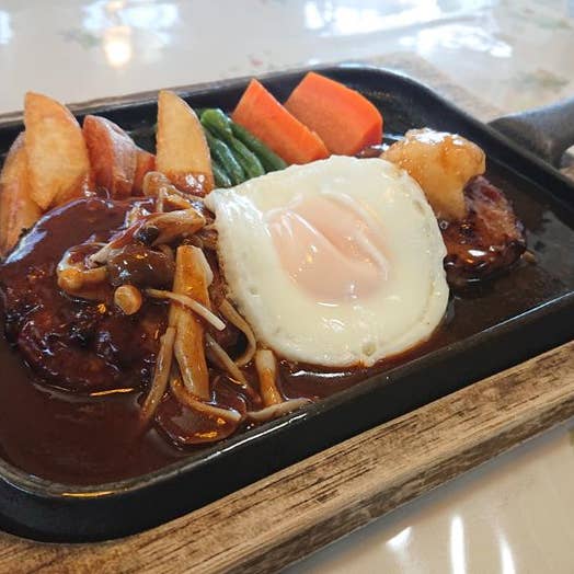 表面だけ焼かれた牛肉100%の丸いハンバーグが、熱々鉄板に乗って登場。