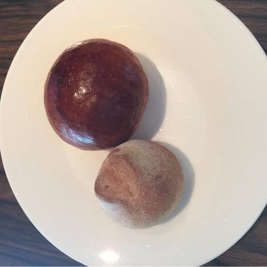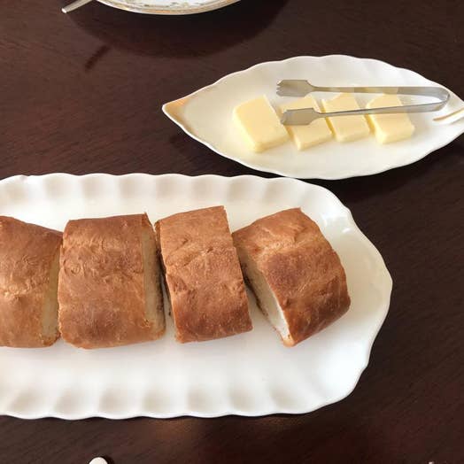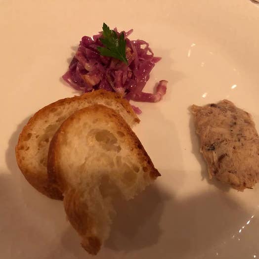 まずは前菜がカリッと焼けたフランスパンとともに登場。パテが二種類ついておりフランスパンに塗っていただくと旨いこと‼️最初からいい感じです。フランスパンが足りません。
