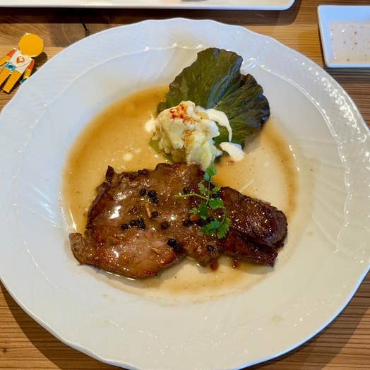 そしてメインの「鶏のロースト」。皮目がパリッと焼き上げられており芳ばしい❗「添えてあるジャガイモがデストロイヤーという品種で・・アンチョビソースが・・」と色々説明を受けましたが覚えておりません。とにかく美味しかったです。(笑)