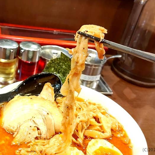 麺はコレまた特徴的で博多とんこつラーメン的な加水率の低いストレートの細麺。