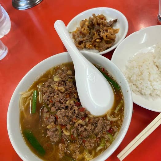 サービスライスを残ったつけ汁にドボンし、ミンチを乗っけて台湾丼で〆