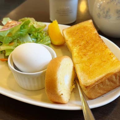 ご自宅の一階を活用した温かみのあるカフェでは、厚切りトーストにバターがたっぷり塗られ、サラダやゆで卵、オレンジ、そして小さなロールケーキまで付いた魅力的なモーニングセットが味わえます。紅茶はたっぷり2杯以上いただけて、このボリュームで480円というコストパフォーマンスも抜群です。ふとしたおもてなしにほっとできる、朝の特別なひとときを過ごせるお店です。次回はカフェスイーツをメインに味わうのもおすすめです。