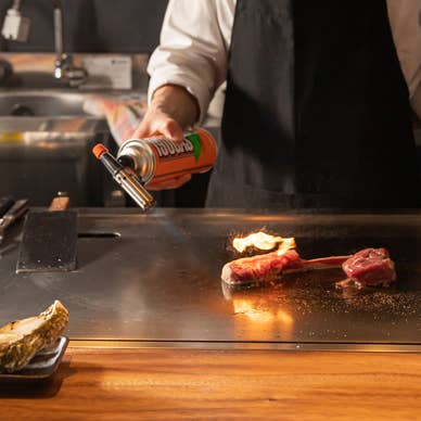 カウンターのお席では、目の前の鉄板で調理するため、五感すべてで味わえるライブ感、 エンターテイメントをお楽しみいただけます。