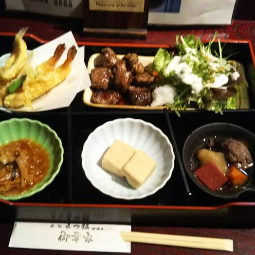 「大津、人通り少ないもんな。でも、このサイコロステーキランチ980円、なかなかの華やいだ感じ、肉は昔ながらの脂少な目ビーフステーキ、ミディアムレア気味の焼き加減で柔らかい。ちょこっと添えられた大根おろしがこ憎いねー、むっちゃ冷たいけど・・・ほいで天ぷら。エビ2匹とキスと野菜。もっと衣大きめにつければしっかりダブルメニューになる。それに、小皿2品、肉じゃがまで付いてる。」