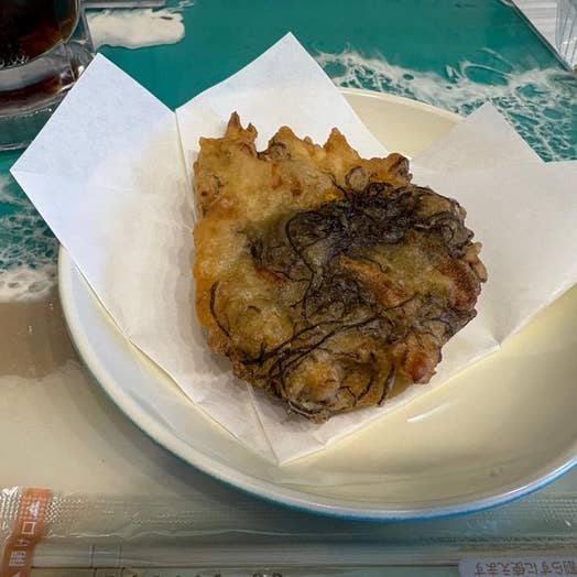 沖縄から仕入れているものが色々あるそうで、もずくもその一つとの事で、もずくの天ぷらを頂きました。揚げたてで太めのもずくが美味しい!