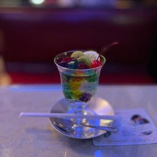 京都の中心部に佇む老舗カフェでは、青い照明と昭和テイストの店内が非日常の雰囲気を演出してくれます。名物のゼリー入りドリンクは、カラフルなゼリーがソーダの中で輝き、思わず見惚れる美しさ。ゼリーは寒天のやさしい食感で、爽やかな微炭酸と絶妙にマッチしています。缶詰のさくらんぼのトッピングも可愛らしく、細部まで心くすぐるこだわりが感じられます。静かな空間で、美しいスイーツとともに昭和の時代へタイムスリップした気分になれるカフェです。回転が速く、タイミング次第で待たずに入れることもあるので、京都散策の休憩にぴったり。レトロな制服や丁寧な接客も魅力のひとつです。