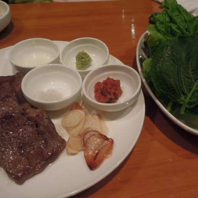 ふらっと入ったお店があたりでした。夜にアラカルトで手作り豆腐(サービス)、サンチュサラダ、九条ネギの海鮮パジョン、何とかという焼肉、スンドゥブ+ご飯つき、甘味(手作り豆腐)サービス、ビール、トウモロコシ茶・・・どれもおいしかったです。一人前ずつを二人で分けて4千円でした。食べて飲んでも一人3~4千円ぐらいでしょうか。九条ネギの海鮮パジョンという分厚いチジミ、甘辛くて美味しい。