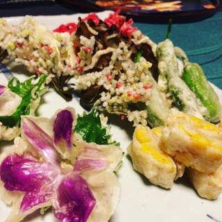 ライトアップされたお寺が幻想的な、とてもステキなロケーション。 中国から伝わった精進料理、普茶料理を提供されてます。 肉、魚を一切使いませんが、鰻の蒲焼きに見立てたものや栗もどきなど、とても工夫をこらしたお料理たち。出汁も昆布のみでとっているそう。 お料理は¥9240と¥11000くらいのコースがあり要予約。 ¥9240のものをオーダー。 ■笋羹(シュンカン) 盛りつけは2人分。 笋羹は煮野菜の盛り合わせで、茄子の田楽、ごぼうに青のりをまぶしたもの、南京などたくさんのものが花と一緒に綺麗に盛り付けてました。 ■梅干の日の出揚げ ■小松菜と丁字麩の和え物 ■雲片(うんぺん) くず引きで八宝菜の原型だそう、これにお肉を足して八宝菜になるそう。 ■油茲(ゆじ) 味付けした天ぷらで里芋、紅しょうが、舞茸、コーン、ししとう、とうもろこし、蘭の花、豆が入っている籠は昆布で編んでいるというのがすごい! ■麻腐(まふ) 胡麻豆腐 ■生湯葉のあんかけ ■鰻の蒲焼きもどき ■栗もどき これらはもどき料理といって魚や肉の擬製品ですが、もちろん本物の鰻ではなく、とうふやごぼうが使われていて黒い部分は海苔。 ■酸菜(さんつぁい) じゃがいもの酢の物 酸菜は酢の物にあたり、じゃがいもと思えないくらいシャキシャキしているこちらは酢がけっこう効いているけど美味。 ■飯子(はんつう)・澄子(すめ) ■果菜(くおぅさい) お寺で頂くお酒も格別。 敷地内にはバーも併設されていて、庭園を眺めながら静かに飲めます。 #ランチ #デート #和食