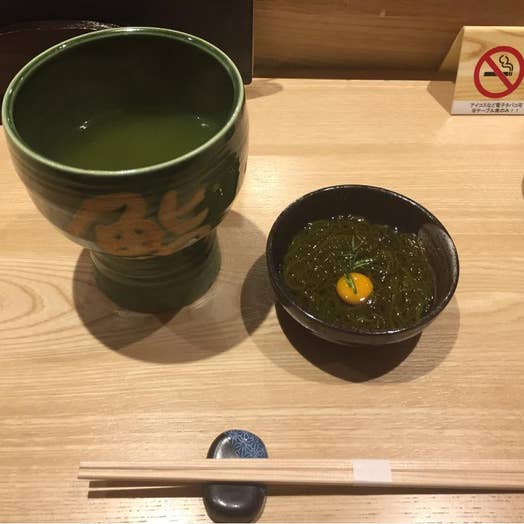 今回のお通し&日本酒は写真の通りで、ゼンマイの和え物と辛口の日本酒を。