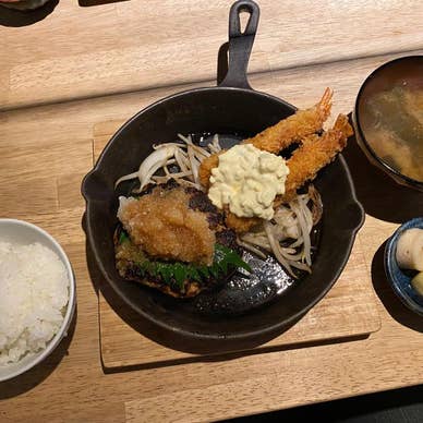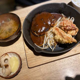 平日のランチにお邪魔しました。 地下鉄今里駅近く「だらけ」さん♪ てごねハンバーグのランチです。 バンバーグソースは デミグラスかおろしポン酢が選べます。 サイドも唐揚げかエビフライのどちらかで。 私はおろしポン酢とエビフライをチョイス。 おろしポン酢でさっぱり美味しくいただきました。 ちなみにご飯はおかわりOKです♪ お腹いっぱい、ごちそうさまでした。