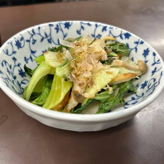A社長との大正はしご酒の1軒目は渋い角打ち 畑酒店です。店の入り口に冷蔵庫があり、好みのお酒を自分で取る事もできますが、最初はサッポロの瓶ビールを。料理はボードのメニューから目玉焼きと青梗菜の炒め物をいただきます。