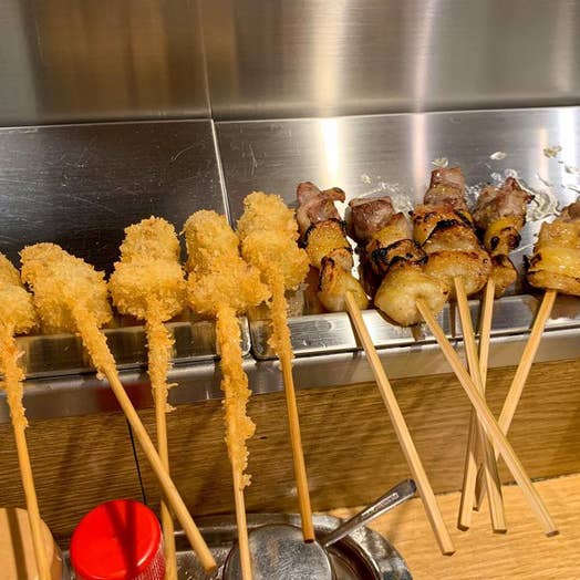 串カツ、純けい、ねぎま、しろに必須のかっぱ、漬物。
