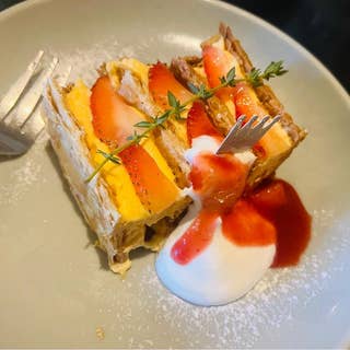 先週末に寄ってみた、めっちゃ可愛いほっこりカフェ。 店内はナチュラルで居心地が良く人気のお店でした。 駐車場には遠方のナンバーの方、若い女の子から、ご近所さんと思われるおばあちゃんまで、各々の時間を楽しんでおられました。 カフェ使いなので、一目見て惹かれたミルフィーユを頂きました。お昼が済んでなかったらランチを食べたかった感じです。