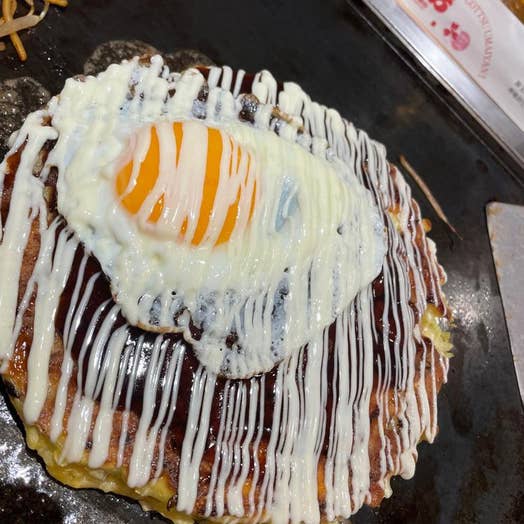 店長おすすめの笑焼き(1,080円)でビールも堪能。(^з^)-☆ なかなかボリュームのあるモダン焼きで、いか、豚、えび、こんにゃく、じゃがいも、そばがひとつに!⤴満腹です。