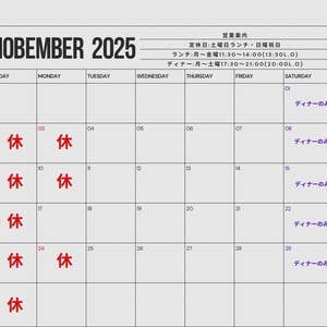 いつもご利用いただきありがとうございます。 11月の定休日は以下の通りです。 ■定休日(赤文字「休」の日) 2日(日) 3日(月) 9日(日) 10日(月) 16日(日) 23日(日) 24日(月) 30日(日) ご来店の際はご確認のうえ、お越しください。 皆様のご来店を心よりお待ちしております。