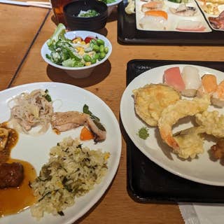 ここは、17時までランチ料金で、食べられるので、16時半頃、早目の夕食を頂きました。ビュッフェスタイルです。 たくさん美味しく頂きました。 最初の写真は、酢豚と、若鶏と、お寿司、次のが、お寿司メイン、そして、野菜、4枚目が白菜としめじの煮物、天麩羅、ご飯はとろろ掛けで、そしてデザートが、抹茶ソフトクリームと、プリン、抹茶ティラミス、フルーツのゼリーです。 ちょうど隙間時間だったようで、お客さんが、われわれだけでした。17時を過ぎてから、お客さんが、ちらほらと入ってきました。 ひとり3,000円でした。 お得意様割引のハガキが、届いていたので、2割引で、食事できました。ひとり2,400円で、済みました。ご馳走様でした。 #食べ放題! #ソフトドリンク飲み放題! #17時までランチ料金!