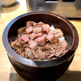 【食肉の卸直営店のオススメ!和牛肉まぶし】 食べログ3.31 最近、ランチタイムはひがし中通り商店街をぷらぷらしてる私。こちらもチェックしていたので、高級ですが気合いを入れて突撃しました。 基本はタッチパネルでオーダーするシステムです。 今回は店のスタッフさん一押しの『和牛肉まぶし』いただきましたぁ〜! オーダーをしたものの10分経っても出てきません( ゚д゚)、、、15分経ち、薬味の大葉、韓国海苔、山葵と青葱、もやしナムル、キムチ、ほうれん草ナムルが並びます。さらに5分が過ぎ、ようやくメインの和牛肉はまぶしが着丼! ビジュアルは 先ずはそのままいただきます。 タレは肉の旨味を感じやすい様になのか?かなり薄味です。ブロックのビジュアル抜群な牛肉は霜降りでジューシー! 次にもやしナムルやほうれん草ナムル、キムチをのせてビビンバ風に、これが肉の脂と辛味が混ざり絶妙に美味しい♪(๑ᴖ◡ᴖ๑)♪ 次に山葵でいただきます!これも肉の脂と山葵が合いますが、アラヒィフの胃にはまだ少し重いので最後にダシでいただきました。 柚子がアクセントで個人的にはこれが一番美味しい*・゜゚・*:.。..。.:*・'(*゚▽゚*)'・*:.。. .。.:*・゜゚・* 今回は時間がなく、ビビンバ風バージョンと山葵バージョン写メ撮るの忘れました_| ̄|○ しかも全て薬味投入からの、ひつまぶし風に気づかなかった、、、。 食べ方のマニュアルがあると親切かなと思います! 自己評価★★2 時間にゆとりがある方なら、一度試してちょんまげでおまっ <勝手ながらの評価基準> ★1・・まぁ普通 ★★2・・これは美味い ★★★3・・うっ美味い また来たい ★★★★4なっ美味しい 絶対また来る ★★★★★5めちゃくちゃ美味しい 感動をありがとうで評価