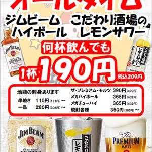 \破格の瑞炎感謝祭開催中!!/ ジムビームハイボール・こだわり酒場のレモンサワーが何杯飲んでも1杯190円!!こだわりの本格焼き鳥や多彩な逸品と合わせてお楽しみください! また、6名以上のコース予約で飲み放題2時間→3時間になるクーポンや、コース注文の方は8名様以上のコース予約で【幹事様1名分無料】とお得なクーポンもございます。みんなで楽しんでください◎