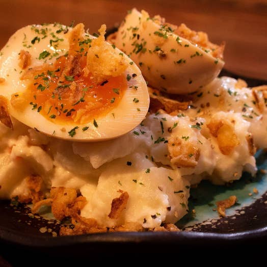 鳥の生ハムをポテサラに重ね合わせて