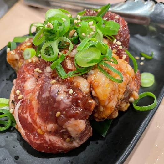 焼きそばに出汁とニンニク入りオイル、大量のキャベツ、花かつお、天かす、豚バラ肉、イカ、エビ、牛、玉子で仕上げたキャベツ焼きに近いモダン。