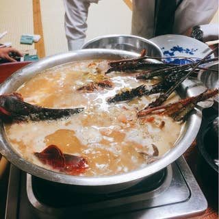 弁天町の最近有名な名店、みや乃。まぁ、とにかく、大勢でいくと価値が何十倍もあがります。写真のとおりの、スゴい盛り付け。上からアワビ、ステーキ、毛がに、ホタテ貝、伊勢海老、ずわい蟹、さかなのあら、そして、巨大なしめじ、うどん、はくさい、が、ひとつの舟に、これでもか、と山積み。もちろん、一人一個づつの、量。その他、おさしみ、とうふ、お寿司など、でるわでるわ。。 まずは。ステーキ。で、鍋します。伊勢海老からはじまって、どんどん出汁がでて、スープの味が変わっていくのが、旨い! こんなに食べて大丈夫か、と思いたくなる感じでしたが、案外、楽勝。店に入るとき、やってるの?と思いたくなる感じでしたが、来てみて正解! なお、かならず、来店の二日前までに予約を。冬はフグだそうです!