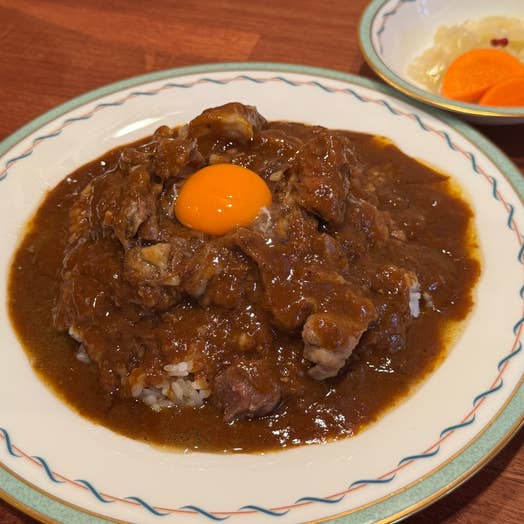 ④残したルーと温泉玉子にご飯ダイブし混ぜ合わせて食べる