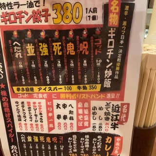 この日の夕食は前回、近くのお店へ伺った際に店名からしてめちゃめちゃ気になっていた此方のお店へ早速伺って来ました…f(^_^;) 先ずはメニューから『ハイボール』と『辛いソーセージ』を頂きましたがピリ辛ソーセージがアルコールの良いアテになって美味いです(o’∀`)♪ その後の本命は此方の名物のギロチン炒飯を頂くことにして辛さ一倍の『へたれ』から辛さ十倍の『ゴッド』迄の七段階ありますが初訪という事と店員さんのお姉さんからのアドバイスに従い辛さ五倍の『鬼』をチョイスして暫しで着皿しましたがビジュアルは至って普通の炒飯… 辛さを覚悟していただけに食してみると辛さより旨味の方が勝ってめちゃ⤴️⤴️めちゃ⤴️⤴️美味いです少し額に汗はかきましたがこれならもう一段階上の『呪』迄は行けたかな~っと…(笑笑)