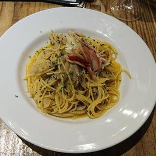 から揚げは福島の大洋軒と同じく、ごま油のきいたサクサクのから揚げ。エビパンはビールのあてにヤバいくらい合う美味さでした(^○^) 〆は牛スジとごぼうの和風ペペロンチーノ。ミョウガのアクセントが効いて(^-^)v