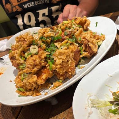 『イタリア大衆食堂 堂島グラッチェ なんば店』の「からあげ定食」 同僚と三人でナンバあたりに出た際に、ちょっと遅い昼ご飯を取ろうということになり、日曜でもリーズナブルな昼食がいただける『堂島グラッチェ なんば店』に訪問しました。 『堂島グラッチェ』は「唐揚げマウンテン」が有名な『福島大洋軒』がプロデュースした本格イタリアン×中華をリーズナブル&カジュアルにいただけるお店です。堂島の本店、福島店、そしてなんば店と三店舗ある中でランチが食べられるのは福島店となんば店のみ。そしてなんといっても名物の唐揚げをリーズナブルにいただけるのはうれしい限りです。 なんば店のランチは三種類。 「パスタセット」は日替わりパスタ(3種から選択)+サラダ+スープで、サラダとパスタは大盛無料です。 「玉子春巻き定食」は玉子春巻き+ライス+スープ+サラダ。 そしておすすめの「からあげ定食」はからあげ+ライス+スープ+サラダです。 オシャレな感じのお店ですのでついついパスタセットをオーダーしがちですが、初めて行くなら「からあげ定食」をチョイスして損なしです。 単品の「鶏のからあげ」が6個630円なのに、ランチだとからあげ5個にサラダとライスが付いて680円。 わざわざ『福島大洋軒』に行かなくても、あのからあげがリーズナブルに味わえる。ぜひ一度味わってみてください。