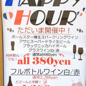 店頭に看板が出ている時間は生ビール、ハイボール、グラスワインがお得に飲める! フルボトルワインも半額! (時間は不定ですのでご来店時に店頭にてご確認ください)