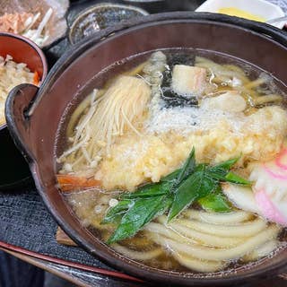 2021年11月6日 岡山 日生の牡蠣 解禁初売りだったので五味の市までドライブがてら牡蠣を買いに行った帰り道にランチで立ち寄りました。うどんは手打ち。お出汁は王道(鰹と昆布かな)コクがあるのにあっさり。美味しかったです。日替わりメニュー 鍋焼きうどん(海老天入り)、炊き込みご飯、大根サラダ、プリン。