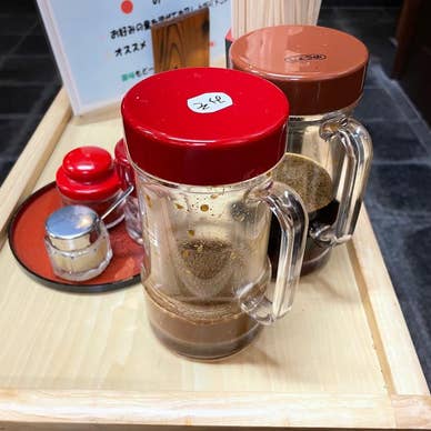 佐用名物ホルモンうどんの店。つけだれは、味噌と醤油の2種。ブレンドでも
