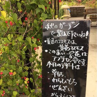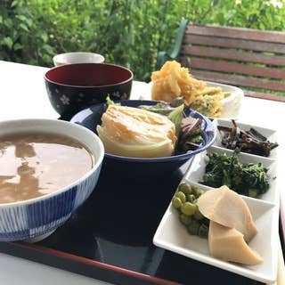 暗がり峠から少し外れたところにある鬼取町のご飯屋さん 自家製野菜をふんだんに使った惣菜と茶粥のランチを頂きました どの惣菜もとても美味しく、特に天ぷらはサクサクで野菜の甘さが絶妙でした ランチのみで700円 デザート(草餅2つorぜんざい)付きで1000円 今回デザート付で草餅を頂きました その場で焼いて頂くのでよもぎが強く香り、お餅が柔らかくとろとろに仕上がってました 山の上のガーデンテラスでのランチ! 景色が綺麗でオススメです