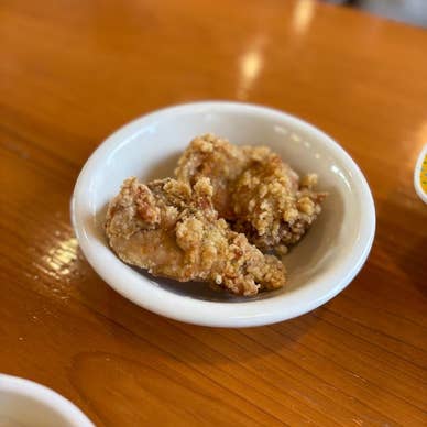 炒め野菜が乗ったあっさりラーメン。 慣れ親しんだ味でホッとする。 それ程期待していなかった唐揚げがめっちゃ美味くてびっくり!一般的な醤油味の唐揚げとケンタッキーのいいとこ取りみたいな味で他の店ではない味。 今まで食べてこなかった事を後悔しました。