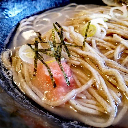 注文して暫し、でてきたのを見てみると器の中に釜揚げうどんのごとく茹で汁と一緒に蕎麦が入ってて。